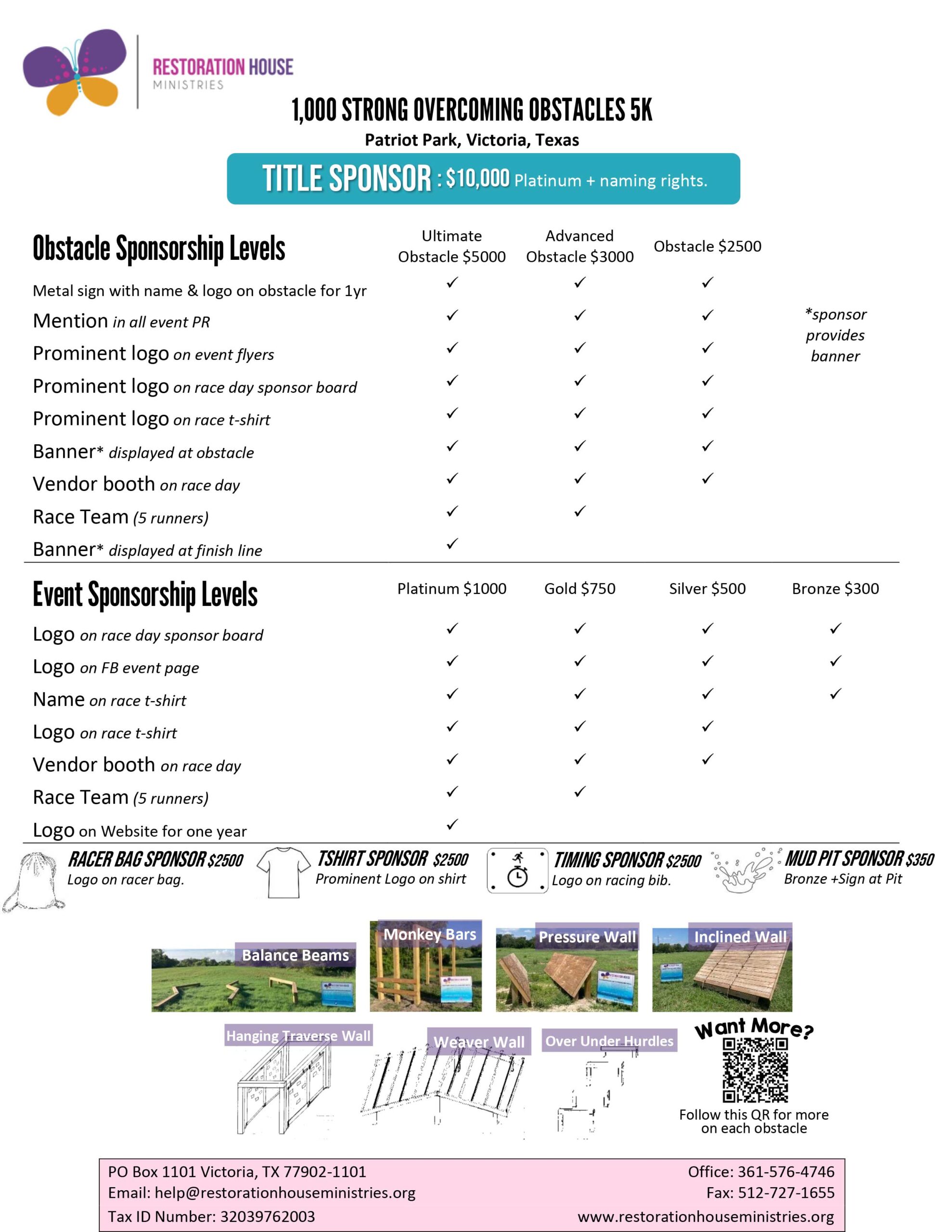 But in order to make the event a success and to allow Restoration House Ministries to continue to support those in need, we need the support of local businesses like yours to underwrite the cost of race production. Please take a look at the sponsorship levels we have available and pray and ponder about how you would like to help restore the women & men in our region through Restoration House Ministries. All proceeds from the 5K go to support the operations and all the various outreach efforts of Restoration House Ministries.